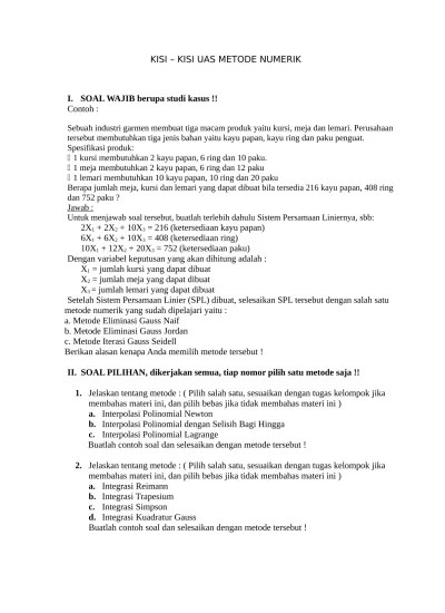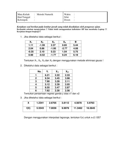 Adapun beberapa hal yang ingin saya sampaikan, diantaranya, bagi mahasiswa yang bebas uas harap tetap masuk untuk tanda tangan. Turunan numerik, integrasi numerik, kuadratur gauss. Soal latihan ujian akhir semester matematika lanjut 2 sistem informasi pilihlah jawaban yang paling tepat! Mahasiswa harus mengikuti 75% perkuliahan untuk dapat mengikuti uas. Nilai pekerjaan uas metode numerik terjelek dapat dilihat di sini nilai terjelek uas met num.