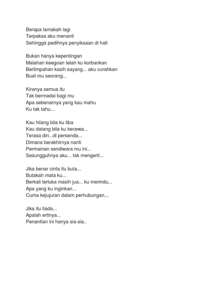 Kerna tak nampak apa selain dia Berapa lamakah lagi / terpaksa aku menanti / sehingga pedihnya penyiksaan di hati / bukan hanya. Request chord services , organizes chords collection. At monday, january 18, 2010. Mon, 18 oct 2021 02:29:00 gmt. Kerna tak nampak apa selain dia. Album ini turut memuatkan dua . Jika benar cinta itu buta. Yang tak akan nampak di mata pun apakah cinta cinta itu buta benarkah cinta hingga ke hujungnya. Type out all lyrics, even if it's a chorus that's repeated throughout the . Jiwa mula bermanja jahatnya cinta. | smule social singing karaoke app. Kerna tak nampak apa selain dia.